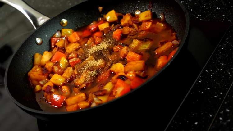 - Dar 2 minutes panardinsime padažą ant viryklės, tada bandysime, jei reikės - įpilkite šiek tiek acto, cukraus ar sojos padažo pagal savo skonį. Uždenkite keptuvę dangčiu ir nukelkite nuo ugnies.