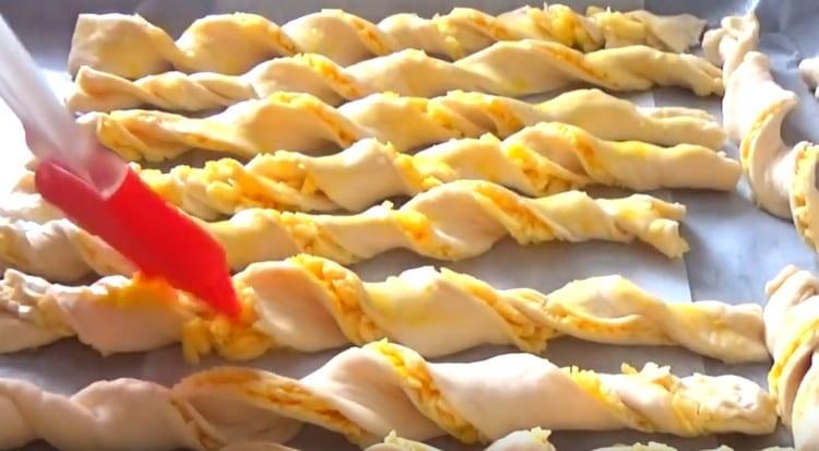 - Dubenyje išplakite antrojo kiaušinio trynį. Gauta mase sutepkite sūrio lazdelių paviršių.