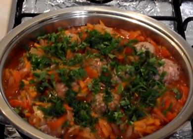 - Iš paruoštos mėsos suformuokite norimo dydžio rutuliukus. Troškintose daržovėse padarykite mažus įdubimus, į kuriuos įdėkite mėsos rutuliukus.