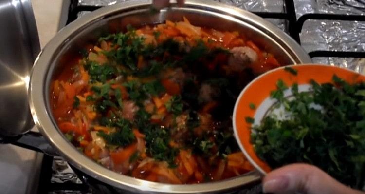 - Įpilkite 2 pjaustytų prieskonių ir 2 lauro lapų. Supjaustykite 50 g bet kokių žalumynų ir pusę į keptuvę įpilkite daržovių ir kotletų.