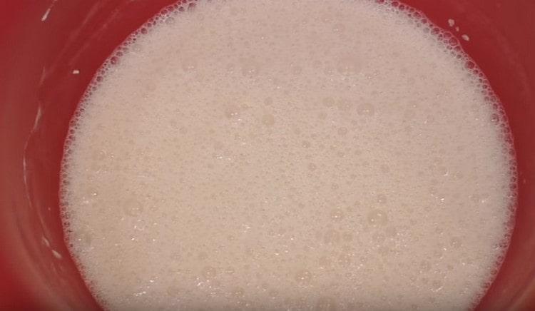 - Pirmiausia paruoškite tešlą minkyti tešlą. Norėdami tai padaryti, vidutinio dydžio dubenyje rankomis atidarykite 30 gramų šviežių mielių.