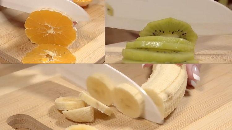 - Supjaustykite vaisius. Tai gali būti bananai, kiviai, obuoliai, apelsinai ir daugelis kitų šviežių gėrybių.