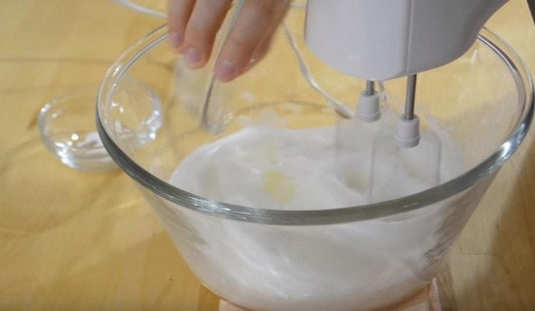 - Į 3 kiaušinių baltymus įpilkite žiupsnelį druskos ir plakite mikseriu iki stabilių baltų putų, pabaigoje įvedame 1 šaukštelį. citrinos sultys. Kad viskas klostytųsi taip, kaip turėtų, maišytuvo šluotelė turi būti švari ir sausa.