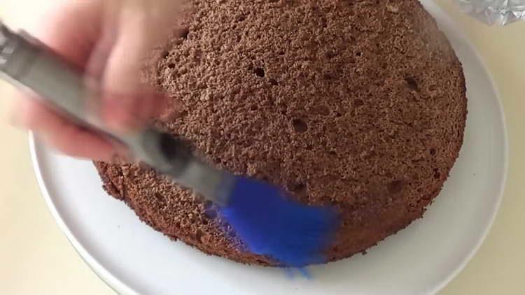 - Biskvitą perpjaukite į dvi dalis.
