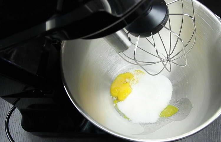 - Į maišytuvo dubenį sudėkite tris trynius, 70 gramų cukraus ir maišą vanilino.