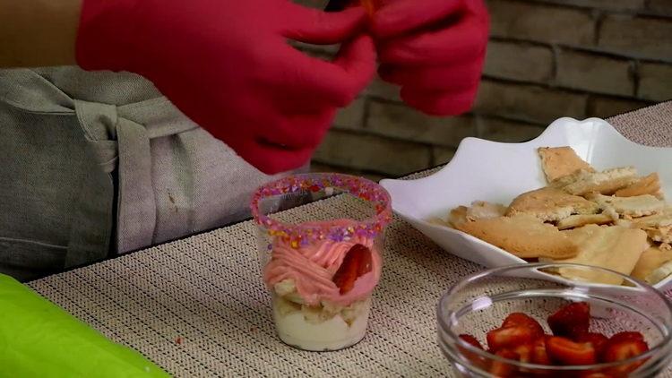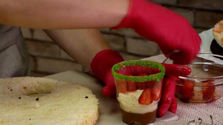 - Paruošiame 50 gramų braškių, kaip aprašyta aukščiau, ir paskleidžiame juos šonuose.
