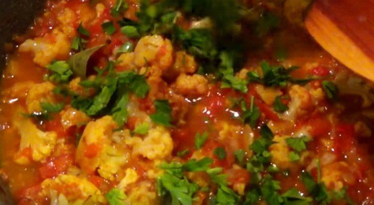 - Tada supilkite pjaustytus pomidorus, išmaišykite, sumažinkite šilumą ir troškinkite 8 minutes po dangčiu. Per tą laiką mes nuplauname krūvą žolelių, rekomenduojame naudoti asortimentą petražolių ir krapų. Truputį nusausinkite ir supjaustykite labai smulkiai.