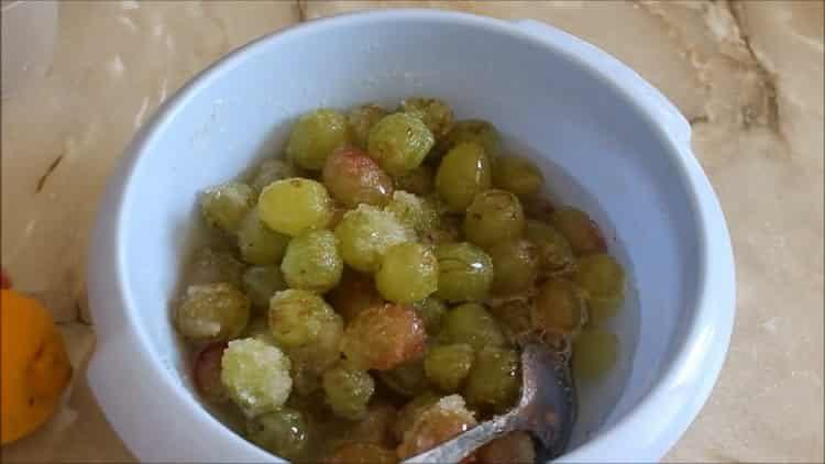 - Palikite vynuoges su cukrumi 12 valandų, kad uogos leistų sultis. Į indą su vynuogėmis įpilkite 100 ml vandens ir 1 citrinos sulčių.