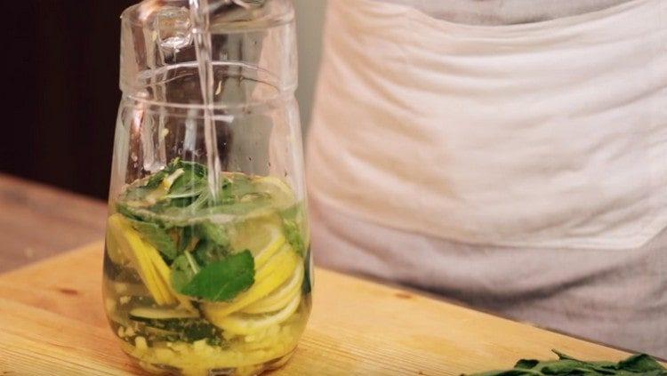 - Galite greitai paruošti kokteilį, plakdami mėtų lapus ir agurką plakikliu, pridėdami citrinos sulčių ir tarkuoto imbiero. Po valandos gėrimas gali būti suvartotas.