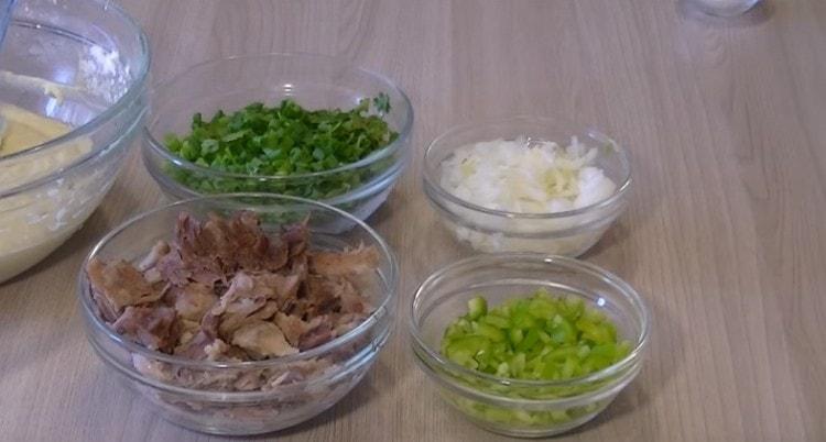 - Įdarui mums reikia 400 g virtos mėsos. Rekomenduojama jį virinti dieną prieš tai pasūdytame vandenyje, atvėsinti. Savo nuožiūra galite naudoti bet kokią mėsą. Aš naudojau liesą kiaulieną. Mėsą supjaustykite mažais gabalėliais. Jei norite, galite pridėti šiek tiek druskos ir pipirų.