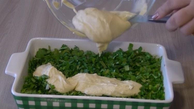 - Tada supilkite likusią tešlą, tolygiai išlyginkite ją ant paviršiaus. Tai bus patogu padaryti silikonine mentele ar šakute.