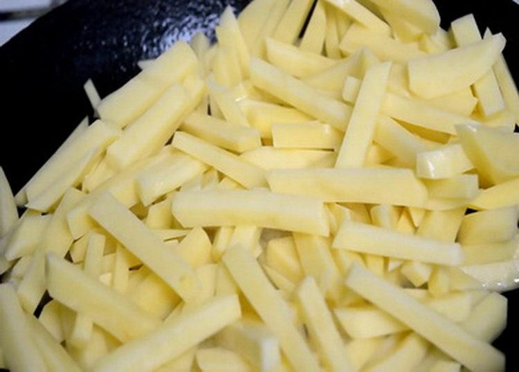 - Mes išvalome ir nuplauname 10-12 vidutinių bulvių. Bulves supjaustykite plonomis lazdelėmis. Apskritai jis gali būti supjaustytas savavališkai. Svarbiausia, kad skiltelės būtų plonos ir gerai pakepintos.