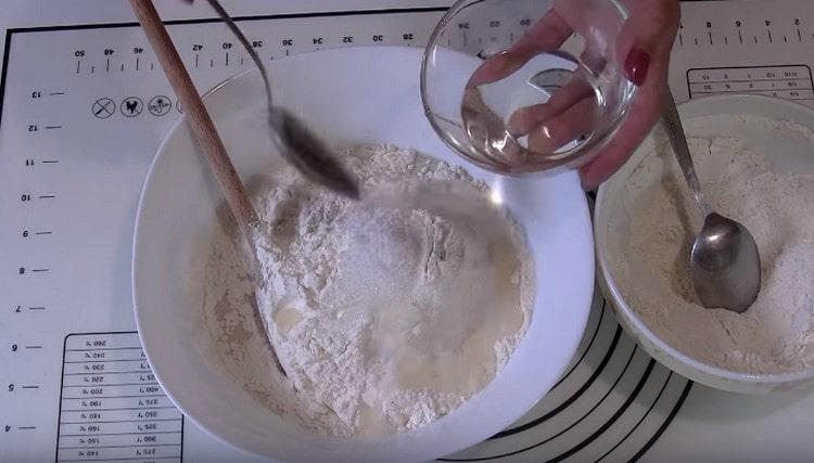 - Išsijokite miltus. Apie 2,5 puodelio miltų, likęs cukrus ir druska, 2 šaukštai. Įpilkite augalinio aliejaus į vandenį ir pradėkite minkyti šaukštu. Po truputį suberkite likusius miltus, toliau minkykite rankomis.