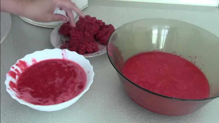 - Iš vytelių išspauskite kilogramą pasirinktų uogų elektrine sulčiaspaude. Surinkite visas atliekas (jos bus šiek tiek skystos konsistencijos) ir nuvalykite pyragą per plaukų sietą arba išspauskite „senamadišku“ būdu per dvigubą marlės sluoksnį.