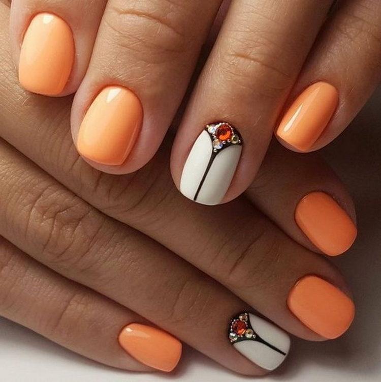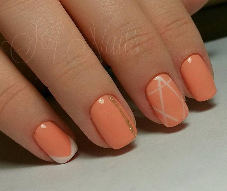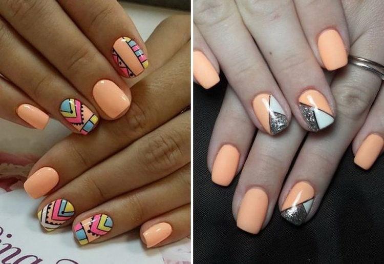 Unghiile la modă în nuanțe de bej sunt în tendință. Stilistii ofera un design cu lac de gel de piersic ca principal (fundal mat) și ca decor. Manichiura de culoare portocalie și piersică în design se combină perfect cu alb-negru, toate nuanțele de gri, cu o paletă în culori pastelate. Unghiile de culoarea piersicii sunt foarte eficiente într-un stil francez. Orice gel sau lac delicat, o culoare ușor de piersic, caisul mai saturat, îl va face pentru el. O manichiură în culoarea piersicii poate fi făcută atrăgătoare prin accentuarea marginii unghiei cu o culoare închisă (de exemplu, ciocolată) și decorarea cu un model în aceeași culoare.