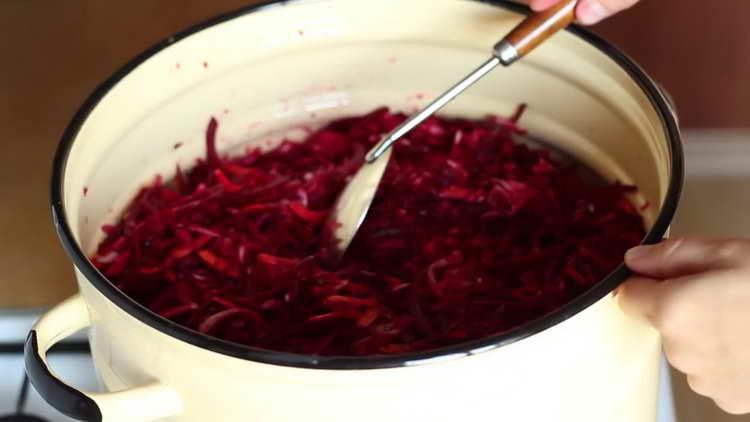 - De îndată ce sfecla sfeclă fierbe, reduceți căldura la minimum, acoperiți tigaia bine și fierbeți până la fiert timp de 30-45 de minute. În acest timp, se recomandă amestecarea legumelor de 2-3 ori.