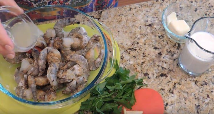 - Adăugați 2 linguri de suc de lămâie în creveți. Se amestecă. Dacă doriți, dacă doriți ca creveții să aibă un gust mai luminos, lăsați-le să se marineze timp de 1 oră.