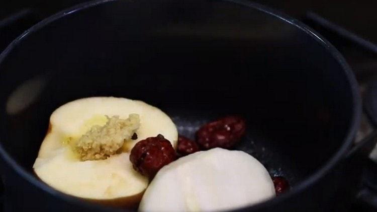 - Acolo trimitem 5 date chinezești, 5 mazăre de piper negru. Măsurăm aproximativ 10 g de ghimbir și 20 g de usturoi, după care mărunțim ingredientele pe o răzătoare fină, adăugăm în tocană.