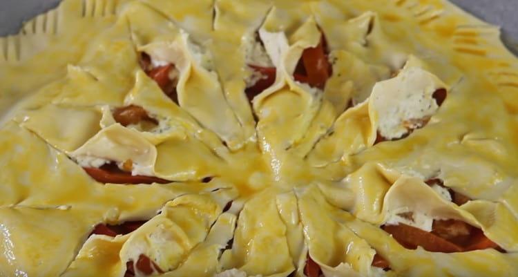 - Ungeți marginile aluatului cu gălbenuș folosind o perie de patiserie.
