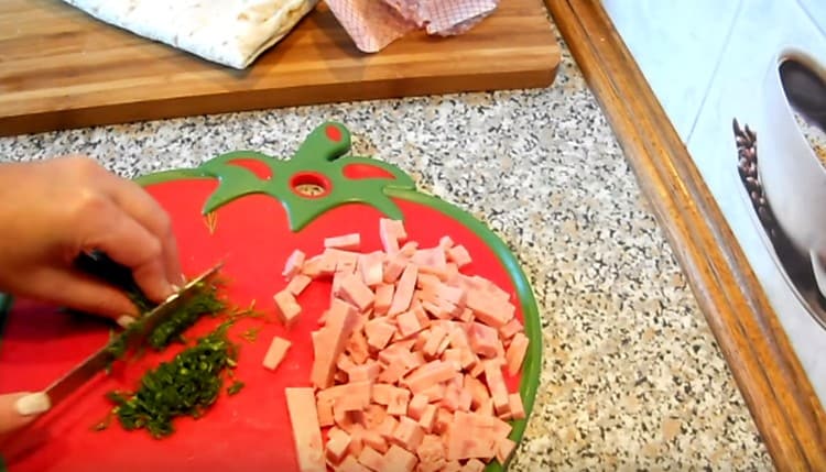 - Spălați o grămadă de mărar și o roșie și uscați bine. Tăiați șunca (500 g) și roșiile în cubulețe mici.