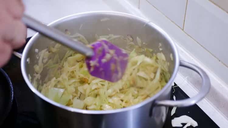 - Imediat ce uleiul s-a încălzit, turnați peste el varza tocată. Se fierbe varza, amestecând periodic și adăugăm apă dacă este necesar, până devine foarte moale și capătă o nuanță aurie. În total, va dura 20-25 de minute.