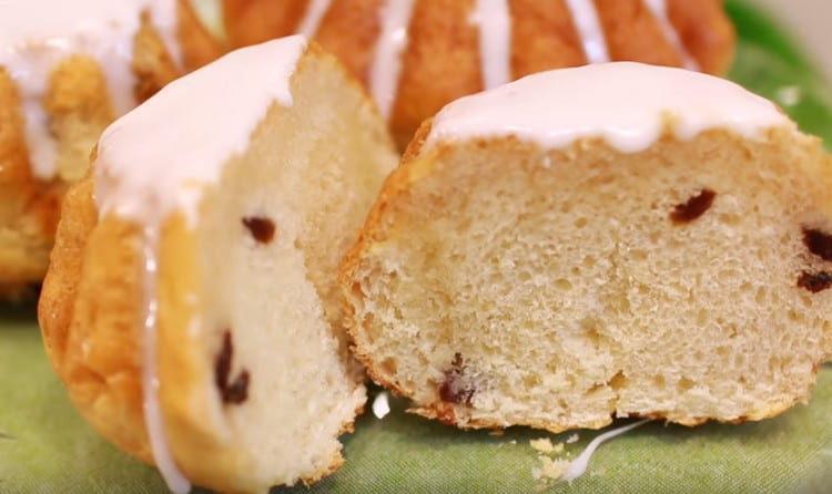 - Înmuiați stafidele în apă clocotită timp de 20-25 de minute, apoi uscați cu un prosop de hârtie. Când aluatul a crescut (după o oră și jumătate), îndepărtați filmul și curățați. Amestecăm stafidele în aluat. Puteți adăuga sau nu adăuga stafide așa cum doriți.