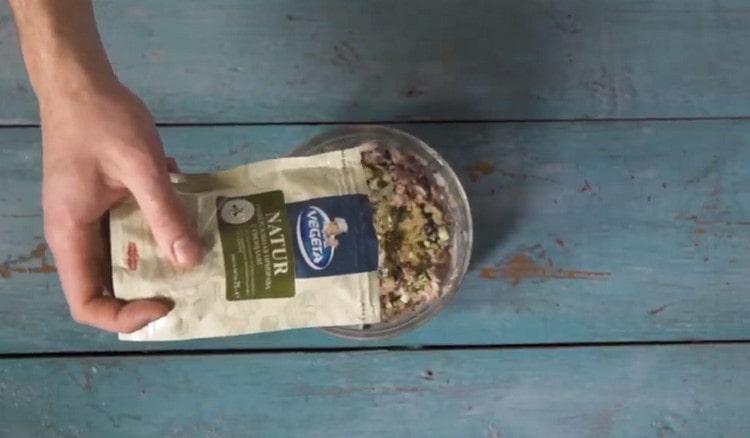 - Condimentăm tonul cu legume cu condimentul VEGETA Natur după gustul nostru. Dacă un astfel de condiment nu ar putea fi găsit, atunci puteți face fără el, adăugând puțină sare și piper la umplutura sandwich. Amestecă din nou ingredientele cu o furculiță.