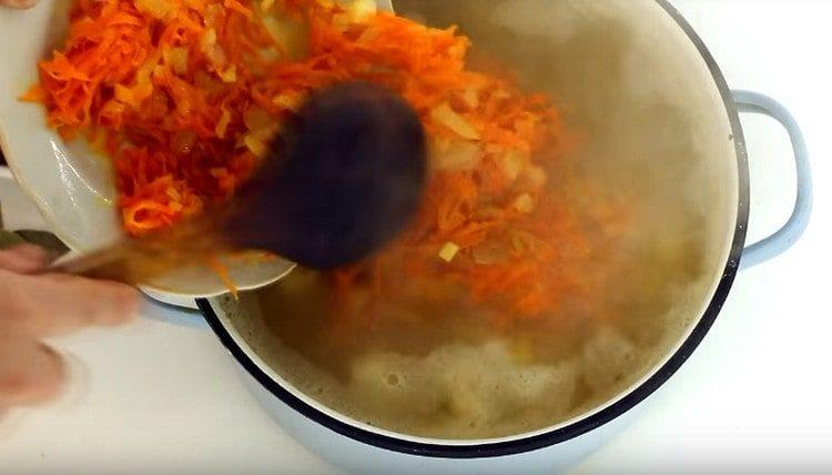 - Se toaca fin 200 g ceapa. Pe o răzătoare grosieră frecăm 250 g de morcovi. Într-o tigaie, încălziți 50 g de ulei vegetal, turnați ceapa și morcovii acolo, prăjiți, amestecând, până la moale (5-7 minute).